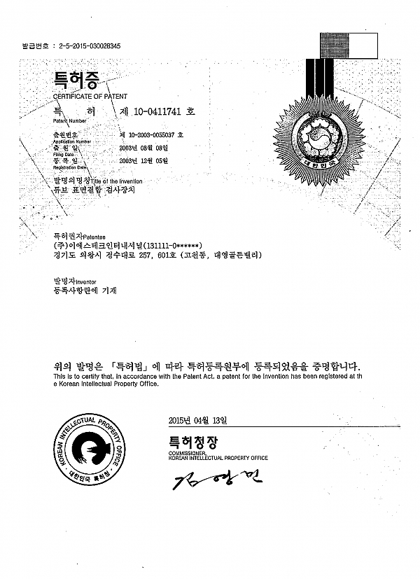 Patent - Inspection device for Tube surface > Certificate